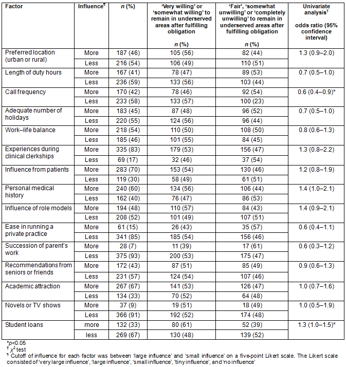 Factors influencing work preferences are shown separately in Table 2 due to the large number of factors. Among these factors, call frequency and student loans were significantly associated with willingness to remain in MUAs. In the factor analysis, six domains emerged: work-life balance, future vision as a doctor, role models, private practice, influence from others, and student loans that will not require repayment after service in a rural community .