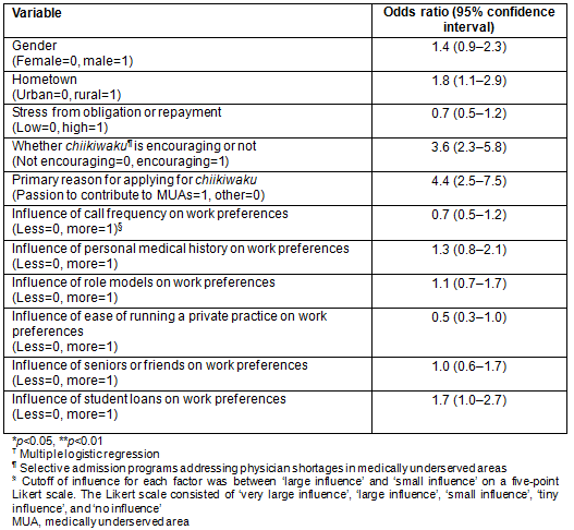In the multivariate analysis, home town type (odds ratio (OR), 1.8; 95% confidence interval (CI), 1.1-2.9), encouragement from belonging to chiikiwaku (OR, 3.6; 95%CI, 2.3-5.8), passion for contributing to MUAs as the primary reason for applying for chiikiwaku (OR, 4.4; 95%CI, 2.5-7.5) and influence of student loans on work preferences (OR, 1.7; 95%CI, 1.0-2.7) were significantly associated with willingness to remain in MUAs after fulfilling the obligation (Table 3).
