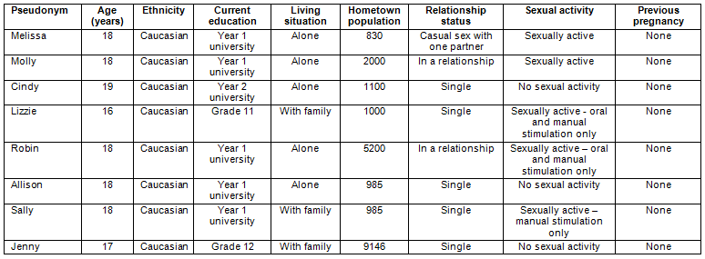 A purposive sample of eight participants was used for this study. Inclusion criteria were self-identification as female between the ages of 16 and 19 years, having lived in rural areas of Ontario with a population less than 30 000 for the majority of their adolescence with a minimum of 1 year, heterosexual, unmarried, and not in a common law relationship. Participants who had been pregnant and/or had given birth were also invited to participate in the study. Adolescent females currently living in a city were included in the study provided they had lived rurally for a minimum of 1 year.