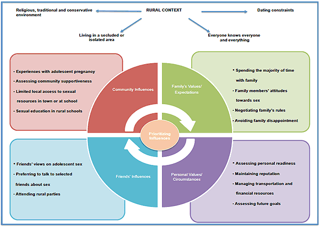 The core sexual decision-making process that participants engaged in, Prioritizing Influences, consisted of prioritizing four key influences: personal values and circumstances, family's values and expectations, friends' influences, and community influences (Fig1). The process of prioritizing involved assessing the influences present in their lives, evaluating the advantages and drawbacks of each decision, and, finally, prioritizing which influence affected them the most. These influences and the sexual decision-making process were embedded in and significantly affected by the rural context.
