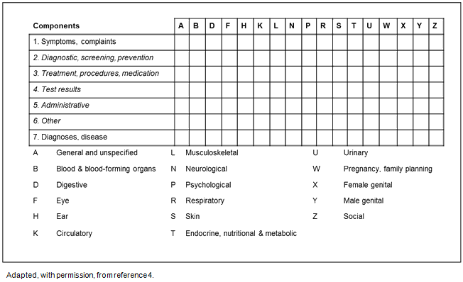 ICPC has a biaxial structure, with 17 chapters on one axis and 7 components on the other (Fig1). Chapters are based on body systems, with an additional chapter for psychological problems and one for social problems. Each chapter is identified by a single alphabetic code, which is the first character of all rubrics belonging to that chapter. The seven components of each chapter are identified by two-digit numeric codes. Component 1 codes symptoms and complaints, component 2 diagnostic and preventive procedures, component 3 treatment procedures and medication, component 4 test results, component 5 administrative tasks, component 6 referral and other reasons for encounter and component 7 diseases.