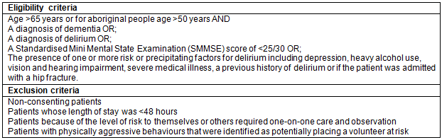 Patients: The primary researcher (CB) identified potential patients by reviewing new admissions on the ward list in consultation with a senior staff throughout the project. Eligibility criteria included presence of cognitive impairment (dementia or delirium) and known risk factors for delirium (Table 1). Patients were prioritised for volunteer support based on the clinical judgement of the researcher. For example, a patient with dementia who was wandering, or an agitated or a drowsy delirious patient, were identified as a first priority; patients with delirium risk factors who were relatively independent were a lower priority.
