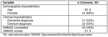 Measures: Patients Those patients able to do so completed the Standardized Mini-Mental State Examination (SMMSE)28. These were either performed by the researcher, another clinical nurse consultant or by other ward staff who had been trained in using the SMMSE. The hospital was already using the SMMSE for cognition screening in the clinical setting, with procedures for the conduct and scoring of the SMMSE in place. Demographic and clinical data collected from medical records included age, sex, diagnosis of dementia or delirium, SMMSE score where completed, length of stay, incidence and number of falls per patient, number of times antipsychotics or other psychotropic medications were administered, and use of analgesics.
