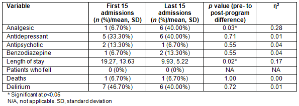 It was impossible to compare outcomes for this sample with data from patients in the period before the program because, pre-project, there was not the same attention to accurate diagnosis and assessment of delirium. Accordingly, to assess improvements over time, the authors looked at length of stay, anti-psychotic and other psychotropic medication use, whether patients were more likely to be on analgesics on discharge, and falls for the first 15 admissions and the last 15 admissions during the data collection period. The beginning of the project was regarded as valid baseline data because the skills and confidence of the volunteers were expected to improve as they gained experience and the project bedded in. No differences were found over time in the number of patients discharged on psychotropic medication. The last 15 patients, however, were significantly more likely to be discharged on analgesic medication, and length of stay was effectively half that of the first 15 patients (Table 3).