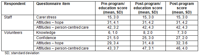 The questionnaire return rate for the volunteers was 100% pre-training and 89% post-program. There was no change over time in dementia and delirium knowledge but there was a change in attitude. See Table 4 for outcome means and standard deviations.