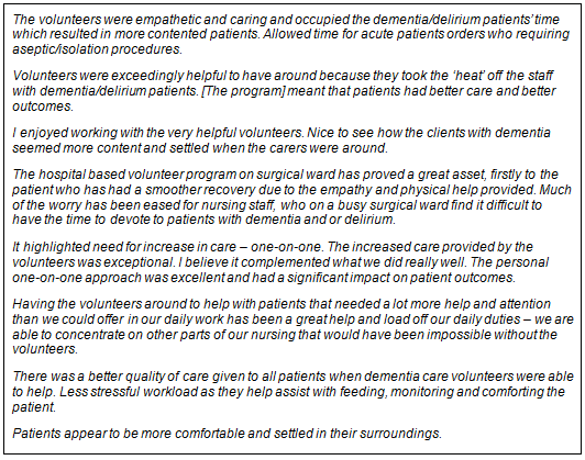 Staff acceptance: Of the 23 nursing staff who answered the qualitative items on the post-project questionnaire, 92% reported enjoyment in the program and 96% either agreed or strongly agreed that it was worthwhile and should continue. An open-ended question about drawbacks/benefits elicited only one outright criticism, from a nurse who otherwise appreciated the program but felt that some volunteers interfered in patient/nurse care. There were some complaints about having to complete the staff questionnaire and two suggestions that there should be volunteers on the night shift - thereby implying endorsement of the program. All the remaining comments (76%) were positive. Consensus between two independent researchers produced five themes. These were improved quality of care for patients because of volunteers' skills, better patient outcomes - in particular being more settled and contented, assistance and support for staff, reduced time-pressure on staff and assistance with nutrition and hydration for patients. Table 5 presents a sample of comments - with the following statement perhaps best encapsulating the majority of comments made: