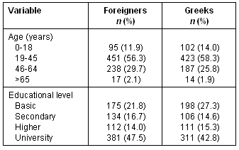 Three hundred and eighty-one (47.5%) foreigners reported university education, compared with 311 (42.8%) of the Greeks tourists, while 492 (61.3%) foreigners were office employees, in contrast with the Greek sample in which the majority, 384 (52.9%), were professionals. The distribution of age and education of the sample is shown (Table 1).