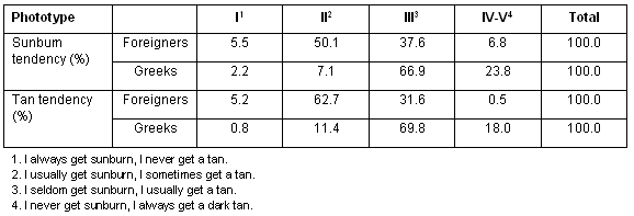The distribution of skin phototypes differed between the foreigners and the Greeks. The majority of foreigners belonged to phototype II or III (sunburn tendency 87.7% and tan tendency 94.4%), while the majority of Greek tourists belonged to phototype III (66.9% and 69.8%, respectively). Foreigners were found to have a higher tendency to burn, and a lower tendency to tan, as is shown (Table 2).