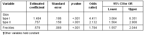 The results of the regression analysis are illustrated (Table 3). Skin type and freckles had a basic significant independent influence on future sunburn.