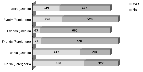On the question 'Rank the three main sources of information relating to sun protection', the media provided the main source of information for both foreigners (480 [59.9%]) and Greeks (442 [60.9%]), with no significant difference between the groups, as shown (Fig 1). Two hundred and seventy-six (34.4%) foreigners claimed family and 74 (9.2%) friends as other sources. The family informed 249 (34.3%) of Greeks, while friends informed 63 (8.7%). Overall, 788 (98.3%) of foreigners and 703 (96.8%) of Greeks were informed about the dangers of sun exposure (p<0.001).