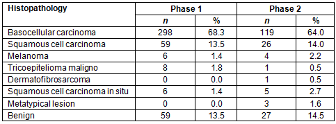 The mean age was 63.1 years (standard deviation=13.1) and 61.7 years (standard deviation=14.2) for patients of phase 1 and 2 respectively. In both phases, most patients had clear skin, skin type (according to Fitzpatrick Scale37) I and II (77.2% and 61.2%), most malignant lesions were located in the region of the face and head and neck (70.3% and 63.7%). The vast majority of lesions were diagnosed at an early stage, 0 or 1 (89.5% and 84.1%). The majority of lesions, were classified as basocellular carcinoma (68.3% and 64%), and melanoma represented 1.4% and 2.2%, respectively, of skin cancers. The pathological results of the first and second phases are shown in Table 1.