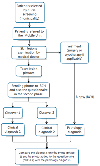 A nurse from the local municipality who was trained previously at BCH screened all patients examined at the MU. A more detailed description of the MU concept has been published previously36. Such local nurses are trained to identify suspicious lesions for skin cancer by BCH nurses and by a physician from BCH with experience in skin cancer screening. A day of training is offered specifically to exemplify the different types of the more frequent skin lesions, and didactic materials (eg image CDs, banners, leaflets and brochures) are given to support the educational training. The nurses and physician from BCH are also responsible for speaking with the clinicians in the municipalities to convince them about the importance of their participation in the prevention activities and also for closely assisting the local nurses' triage. In addition, they are encouraged to principally invite the underprivileged people that live in the suburbs or in rural areas and to inform them that all of the procedures related to the cancer prevention and treatment are free36.