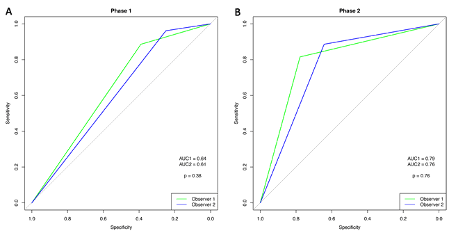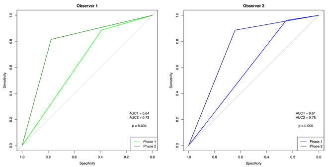 Comparison of the two phases shows that the ROC curves for the observers increased significantly (observer 1: p=0.003; observer 2: p=0.002) (Figs 2,3).