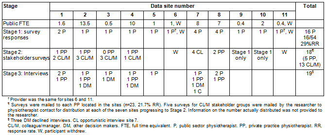 Public sector physiotherapists were prioritised in the research design, because a greater reliance on the public sector for the provision of allied health services, including physiotherapy, has been reported in rural and remote regions of Australia11. Private physiotherapists formed a second focus, because an increasing proportion of the physiotherapy workforce work in the private sector10. Key stakeholder groups included multidisciplinary team colleagues, consumers, managers and other decision makers. Stakeholder perspectives were obtained through surveys and in-depth interviews. Obtaining perspectives of multiple stakeholders avoided isolating the research to a physiotherapy-only perspective16.
