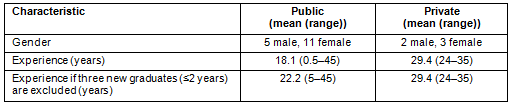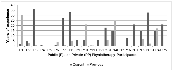 Figure 1: Years of physiotherapy experience: public and private physiotherapy participants.