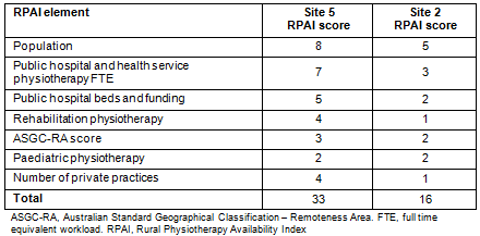 The sites of this study were predominantly rural with RPAI scores clustering in the mid-range; however, the RPAI scoring would enable differentiation of major urban areas and more remote sites. The RPAI score provides a relatively speedy tool to gain insight into the availability of physiotherapy services. Such information could be considered by health service policy and decision makers prior to making decisions that may adversely affect the availability of physiotherapy services for local communities.