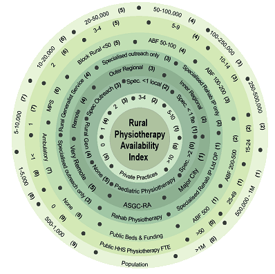 The conceptual framework or index of rural physiotherapy availability incorporates the differentiating factors or elements that emerged from participant comments. Scoring elements, such as the provision of rehabilitation services, make explicit the availability of specific services. The total score for the combination of elements then provides a more comprehensive picture and understanding of availability of rural physiotherapy services. Making local service availability more explicit, by using the RPAI for example, can assist decision making about local service provision by highlighting service variations and gaps. The advantage of the RPAI having both an aggregated score and a score for each element is that it enables insight into the specific service variations. For example, it can highlight gaps in service availability for specialised paediatrics or private physiotherapy services. This may enable better resource allocation decisions to address areas of unmet needs. Additionally, explicit descriptions of local service availability and capacity may be of assistance when developing models of care, for example outreach or hub and spoke models common in rural areas. The conceptual framework of rural physiotherapy availability may also be applicable to other rural allied health service providers.