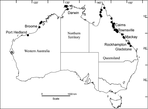 During November and December 2003, a telephone survey was conducted of coastal hospitals and health centres responsible for the primary management of Irukandji syndrome patients from Gladstone in Queensland to Port Hedland in Western Australia. A total of 34 institutions were identified for contact following communication with the relevant District Health Managers. Some District Managers specified which institutions could be contacted, and one District Manager did not respond to requests for permission to contact institutions under his jurisdiction. Coastal health facilities were selected on the assumption that an Irukandji sting patient would seek help from the nearest health facility.