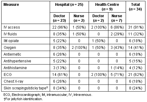 Interview participants were recruited by telephoning the identified institutions and asking to speak to the health professional who would be responsible for the primary management of a patient with suspected marine stinger envenoming on the survey day. Participation was voluntary, and respondents were assured of personal and institutional confidentiality.