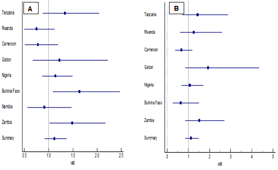 Figure 4: Forest plots of adjusted hazard ratios for effect of female household headship on rural infant (A) and childhood (B) mortality in eight countries of sub-Saharan Africa.