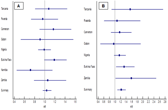 Figure 5: Forest plots of adjusted hazard ratios for effect of extended vs nuclear household structure on rural infant (A) and childhood (B) mortality in eight countries of sub-Saharan Africa.
