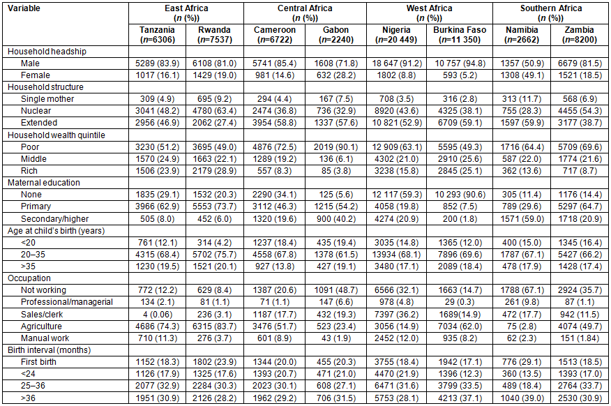 In this study, children recode files for each of the eight selected countries were used. The children recode files contain the maternity history of births within 5 years of the survey as well as other relevant characteristics of the women. The sample analysed was single live births in rural areas. The final sample sizes were 6306 (Tanzania), 7537 (Rwanda), 6722 (Cameroon), 2240 (Gabon), 20 449 (Nigeria), 11 350 (Burkina Faso), 2662 (Namibia) and 8200 (Zambia).