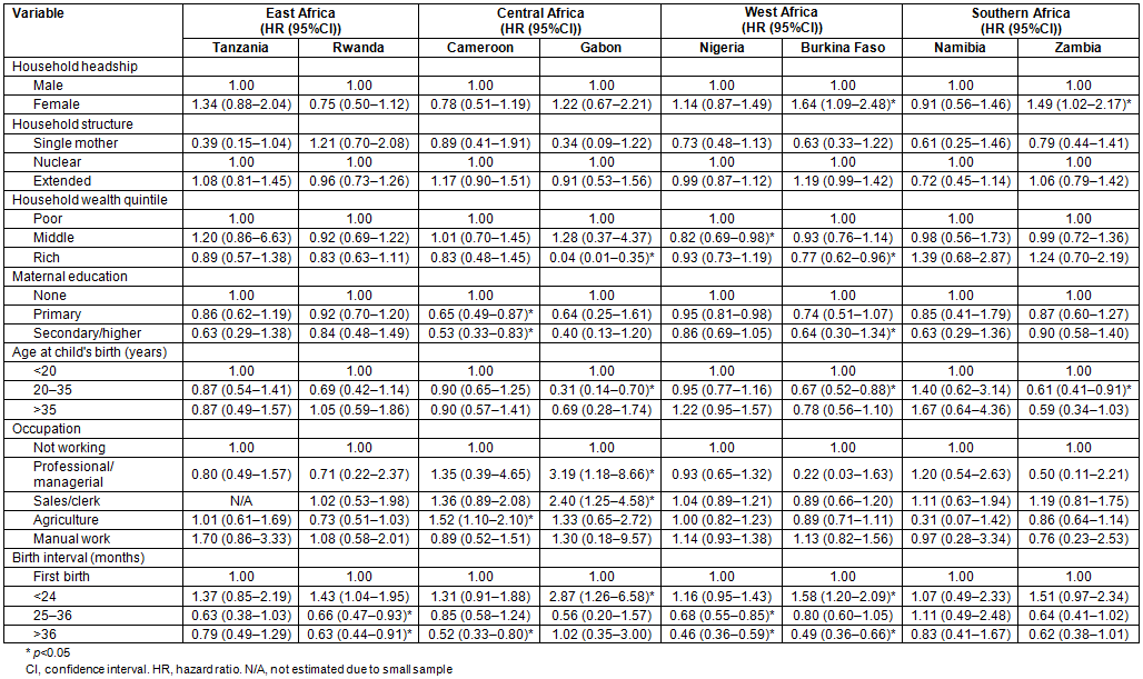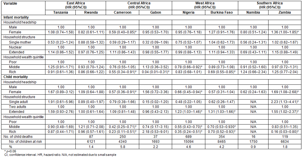Multivariate models: Results for the models fitted to describe the relationship between infant mortality and the explanatory variables are presented in Table 4. Children in FHHs had significantly higher risks of infant death in Burkina Faso (HR=1.64, 95%CI: 1.09-2.48) and Zambia (HR=1.49, 95%CI: 1.02-2.17). The risk was also higher in Tanzania, Gabon and Nigeria but did not attain statistical significance. Although household family structure was not significantly associated with infant death in any of the eight countries, infants in single-mother families enjoyed survival advantage compared to those in nuclear families in all countries except Rwanda. Middle and rich household wealth quintiles had a protective effect against infant deaths in all countries except Namibia and Zambia where rich wealth quintile was, surprisingly, a risk factor. Maternal secondary/higher education reduced the likelihood of infant death in all countries by a magnitude ranging from 60% in Gabon (HR=0.40, 95%CI: 0.13-1.20) to 10% in Zambia (HR=0.90, 95%CI: 0.58-1.40). Professional/managerial work (relative to those not working) was a risk factor for infant death in Gabon (HR=3.19, 95%CI: 1.18-8.66) and Namibia (HR=1.20, 95%CI: 0.54-2.63) while it was the reverse in other countries. Agricultural work was risky for infant survival only in Cameroon and Gabon. Infants born 36 months after a previous birth were found to have better survival chances in all the eight countries with the exception of Gabon.