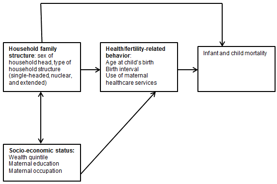 This study is based on a conceptual framework adapted from previous studies on household structure and childhood nutritional status and health care44-46. In the framework (Fig1), it is hypothesized that household structure influences child survival by operating through either socioeconomic status or health/fertility-related behavior. For instance, household socioeconomic status determines household living conditions, food intake and treatment-seeking behavior. The time available for a child's care is assumed to be affected by occupation of the mother. Use or non-use of appropriate maternal and child healthcare services has been shown to be a key determinant of child survival47,48. The presence of other household members may also positively affect caregiving for a child. Included were control variables that represent a woman's fertility behavior (age at child's birth, birth interval), which are also known to be closely associated with maternal education49.