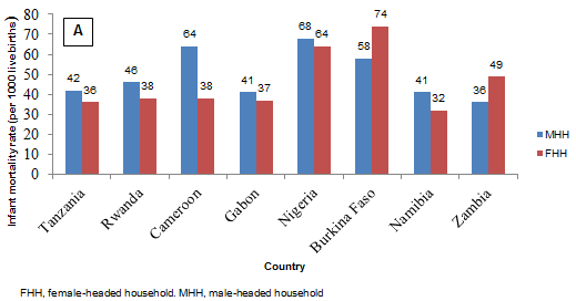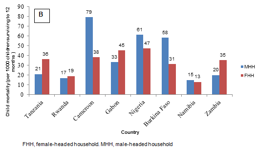 Figure 2: Rural infant (A) and child (B) mortality rates according to sex of household head in eight countries of sub-Saharan Africa.