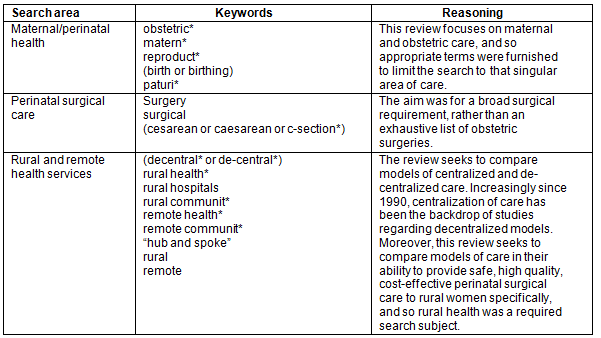A wide variety of plausible issues, relevant to the centralization of maternal surgical care, were captured by an intentionally broad primary search structure. While search terms were intended to maximize sensitivity, search limiters were used on language (English) and year (1990), in keeping with a rapid review tradition as well as a realist review approach. MEDLINE, PubMed, EMBASE, CINAHL, EBM Reviews, NHS Economic Evaluation Database, and PAIS International for literature were searched. Keywords associated to each search area as well as the reasoning behind the search strategy are summarized in Table 1.