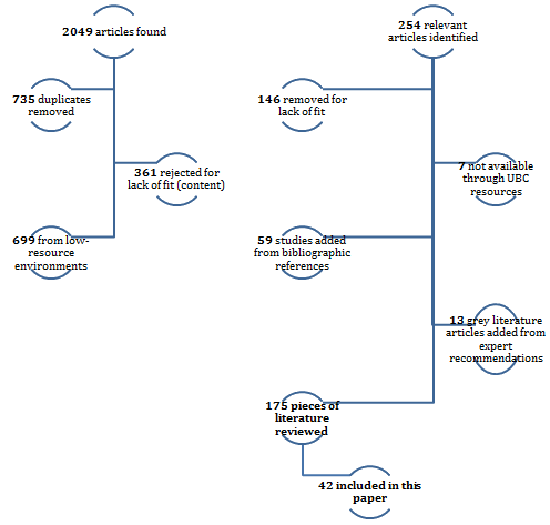 Database searching resulted in 2049 total resources, of which 735 were duplicate records across different databases. Manual abstract exclusion eliminated a further 1060 as from developing settings (n=699) or irrelevant (n=361) (Fig1). Of the remaining 254 resources, 192 were included for full article review after literature on best practice evidence for specific conditions (eg HIV, pre-eclampsia or diabetes) (n=27), and on defensive medicine and litigation concerns (n=35) were excluded.