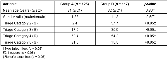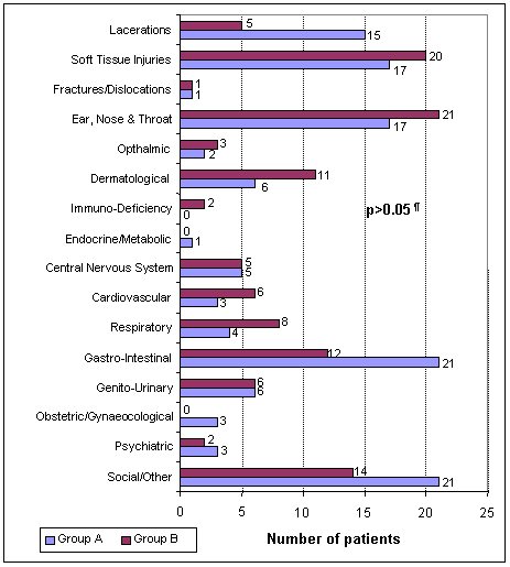 The results of the comparison of the independent variables of age, gender and triage category are shown (Table 1) and the age distribution is shown (Fig 1). The distribution of patients across these 'diagnosis categories' for Group A and Group B is shown (Fig 2). It is apparent that there was no statistically significant difference for any of these variables (p > 0.05) and that the two groups were, therefore, comparable.