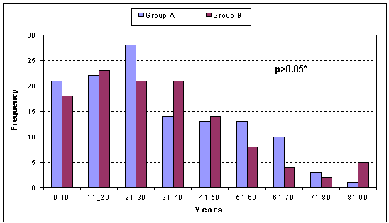 Figure 1: Age distribution for group A and group B (two-tailed t-test [α = 0.05]).