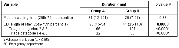 The potential effect on the data of excluding the three multi-trauma patients from group B is acknowledged and may be regarded as problematic. However, when a trauma case is in the department, specialists and registrars are called in and so it can be argued that the impact on the rostered medical staff in the ED should not be great. There is a greater impact on the nursing staff, although this too is moderated by the night supervisor and intensive care unit nurses being called if necessary. The authors believe that the considerable difference between the outcome variables in each group could not reasonably be attributed solely to this effect.