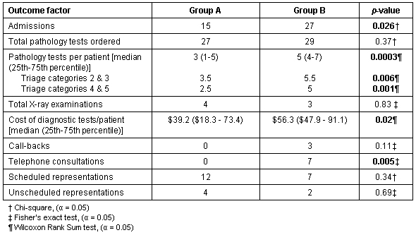Having compared the independent variables, the waiting time and EDLOS for the two groups were described in terms of median and 25th-75th percentiles because they were not normally distributed. The non-parametric Wilcoxon Rank Sum test was used to test the statistical significance of the differences in these times between the two groups. The number of admissions, pathology tests, X-rays, call-backs, telephone consultations and re-presentations (scheduled and unscheduled) were also compared and assessed for their statistical significance using either c2 analysis or the Fisher's exact test, as appropriate. For those patients who had pathology tests ordered, the number and cost of tests per patient was compared again using the Wilcoxon rank sum test.