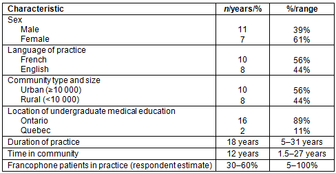 A total of 18 interviews were conducted, with physicians practicing in nine francophone communities across Northeastern Ontario (Table 1). Saturation was achieved after the 15th interview. Data collection was continued past saturation to ensure an adequate representation of rural and urban physicians as well as French-speaking and non-French-speaking physicians, which was achieved when saturation occurred within these subgroups.