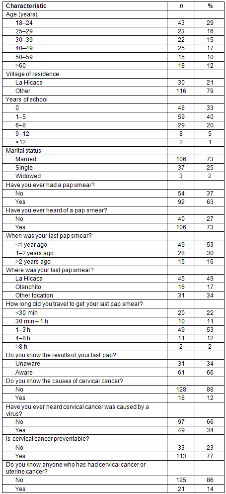 One hundred and forty-six surveys were completed. Survey respondents are detailed in Table 1. Figure 1 summarizes self-reported pap smear by age group. Older respondents were more likely to have been screened than respondents aged 18-24 years (p≤0.0001). Table 2 summarizes the comparative statistics among all survey respondents. Respondents knowledgeable about cervical cancer prevention were more likely to have ever had a pap smear (p=0.0054). Table 3 highlights the differences between La Hicaca and the surrounding villages in relation to risk factors, knowledge of and access to cervical cancer screening services. Respondents from surrounding villages had to travel further to visit a pap smear clinic than did respondents from La Hicaca (p<0.0001). Respondents from La Hicaca were significantly more likely to receive the results of their pap smears than were respondents from the surrounding villages (86% (19/22) vs 60% (42/70), p=0.0367). The respondents of the surrounding villages were more likely to believe that cervical cancer is preventable than were the respondents of La Hicaca (82% (95/116) vs 60% (18/30), p=0.0106).