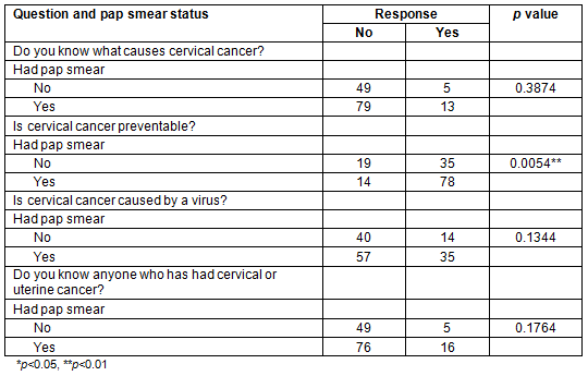 Of the five women who answered 'yes' to having received an abnormal pap smear and failed to follow up, one respondent said that it was too far to travel and that she did not have enough money to do so. The others offered no specific reason for failure to follow up.