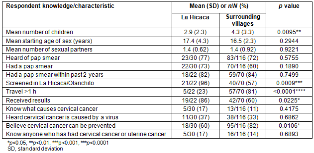 Table 3: Risk factors, knowledge of and access to cervical cancer screening services, La Hicaca vs surrounding villages