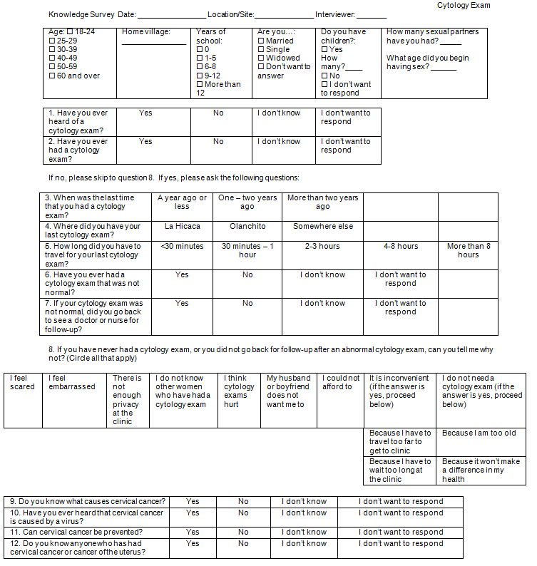 Appendix A: Study questionnaire on risk factors for and knowledge of causes of cervical cancer, and barriers to obtaining cervical cancer screening services