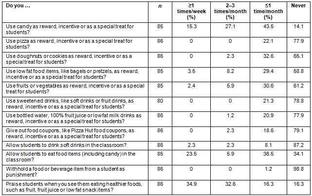 Table 1 presents the frequencies of teachers' classroom food practices. Most teachers (85.9%) used candy as a reward/incentive for students. Other foods used by at least one-third teachers included low fat items, such as bagels or pretzels (41.1%), fruits and vegetables (38.9%), and doughnuts or cookies (34.9%). For the most part, teachers indicated that the use of foods as rewards/incentives occurred one or fewer times per month; however, more than 42% of teachers reported using candy at least two to three times per month. In addition, nearly 66% of teachers allowed students to eat in the classroom and almost 13% permitted students to drink soft drinks in the classroom, while about 84% reported that they praised students when they saw them eating healthier snacks or beverages.