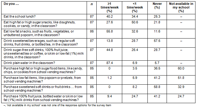 Table 2 shows the results pertaining to teachers' eating behaviors at school. Most teachers reported drinking plain water (94.3%) and eating low fat snacks (88.4%) in the classroom. However, a substantial percentage also reported consuming high fat or high sugar snacks (78.2%) and sweetened beverages (42.5%) in the classroom, although the majority of teachers reporting these behaviors indicated that the behavior occurred less than once per week. More than half of the teachers reported that high fat or high sugar food items were not available in vending machines at their school, but that sweetened beverages were available. Purchases of sweetened beverages and high fat or high sugar foods from school vending machines were uncommon.