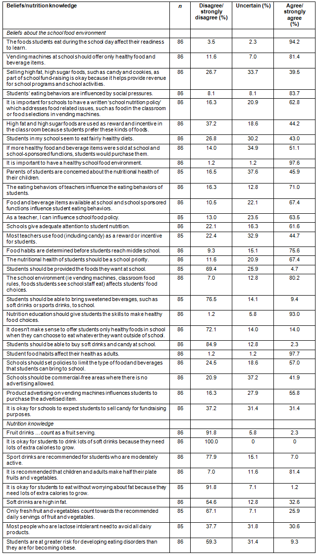 Table 3: Frequencies of teachers' reported beliefs about the school food environment and nutrition knowledge in rural Oregon