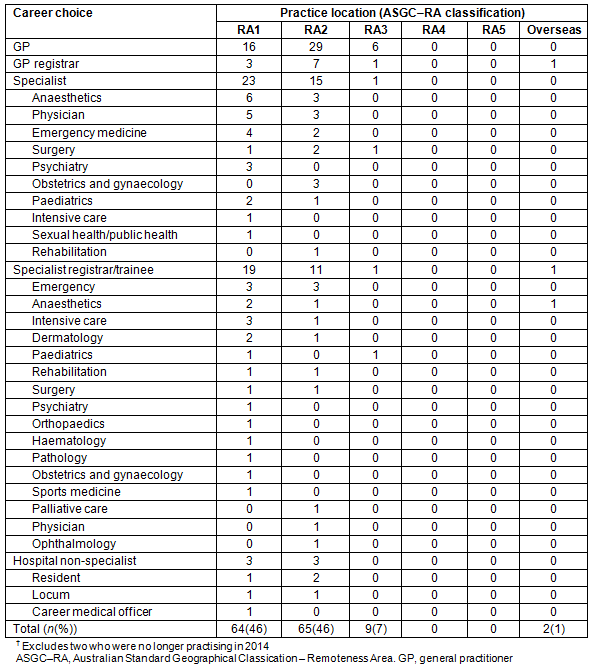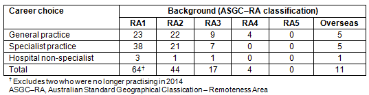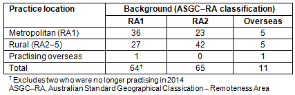 Significantly, more than half of cadets in this analysis were working in rural locations (RA2-5) in 2014 compared with 21% of all medical practitioners nationally14.