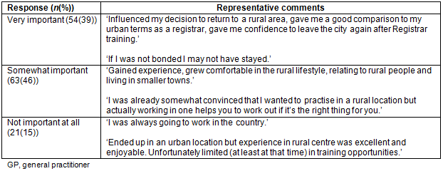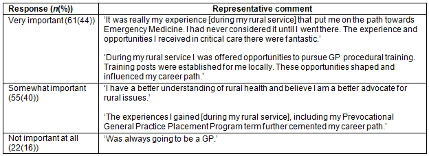 Table 6: Representative responses to 'How important was the cadetship and period of rural service in influencing your decision to practise rurally?' (n=138)