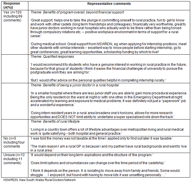 Would former cadets recommend the program to others? The questionnaire also asked if former cadets would recommend the cadetship to other medical students, with 138 of the 142 participants responding (Table 7). Of those, 87% (n=120) said they would recommend the cadetship to other medical students, although 10 of those qualified their responses. The most common qualification was having a real interest in working and living in a rural centre and a willingness and ability to fulfill the 2-year bond (not having commitments keeping them in a metropolitan area). A small group of cadets also expressed concerns around access to training programs other than general practice, with one cadet claiming rural training makes it harder to move back to the city for specialist training.