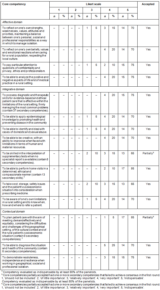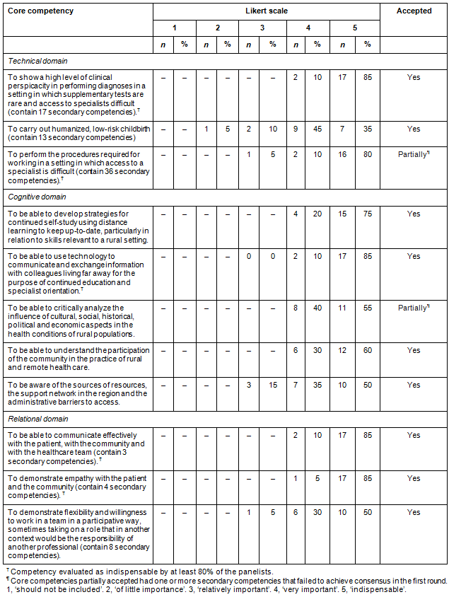 The literature review identified 95 articles related to the topic, 15 of which listed competencies in rural medicine and were used by the principal investigator of this study to construct the first-round questionnaire. This consisted of 26 core competencies and 165 secondary competencies, which, in accordance with the multidimensional aspect of the professional competency, were later grouped into six domains: cognitive, technical, affective, relational, integrative and contextual, as proposed by Epstein and Hundert24. Adhesion to the study was 52% (n=20): 80% (12/15) among medical professors and preceptors, 100% (3/3) among the health managers and 45% (9/20) among those working predominantly in patient care. In the first round of the Delphi technique, consensus was obtained for the 26 core competencies. Of these, 26.9% (n=7) were evaluated by 80% or more of the participants (n=16) as 'indispensable' competencies:
