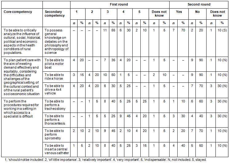Although various suggestions were made, all of them referred to items that had already been included in the questionnaire and no new competency was suggested. Nevertheless, it was proposed that rural medical training in Brazil should be provided within the specialization program in Family and Community Medicine, since medical training cannot be restricted only to the undergraduate medical course. The need for specialization to enable a doctor to work in primary healthcare was emphasized.