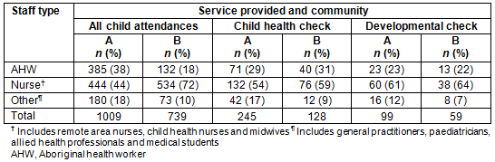In Community A, AHWs saw 38% of all child attendances and were responsible for conducting and recording more of the acute child presentations and fewer of the 'well-child' checks (Table 1). In Community B, 18% of all child attendances were seen by AHWs and the proportion of attendances seen by AHWs for child health checks was 31%. However, developmental checks were conducted by AHWs in only one-fifth of clinical encounters (22%) in Community B. Notably, the majority of developmental checks in both communities were completed by nurses (Table 1).