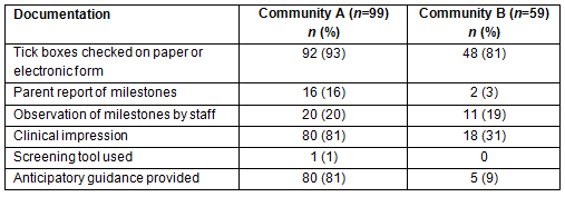 Documentation of developmental checks varied across the two communities (Table 2). Community A used paper records and 93% of all the checks were recorded on the HU5Ks care plan. Additionally, some developmental notes were documented in the progress notes, with a proportion using both. Electronic records were used in Community B and very few had information regarding the developmental checks undertaken recorded on the HU5Ks care plan (9%). These were mostly documented on a checklist in the 'visit' section (90%).